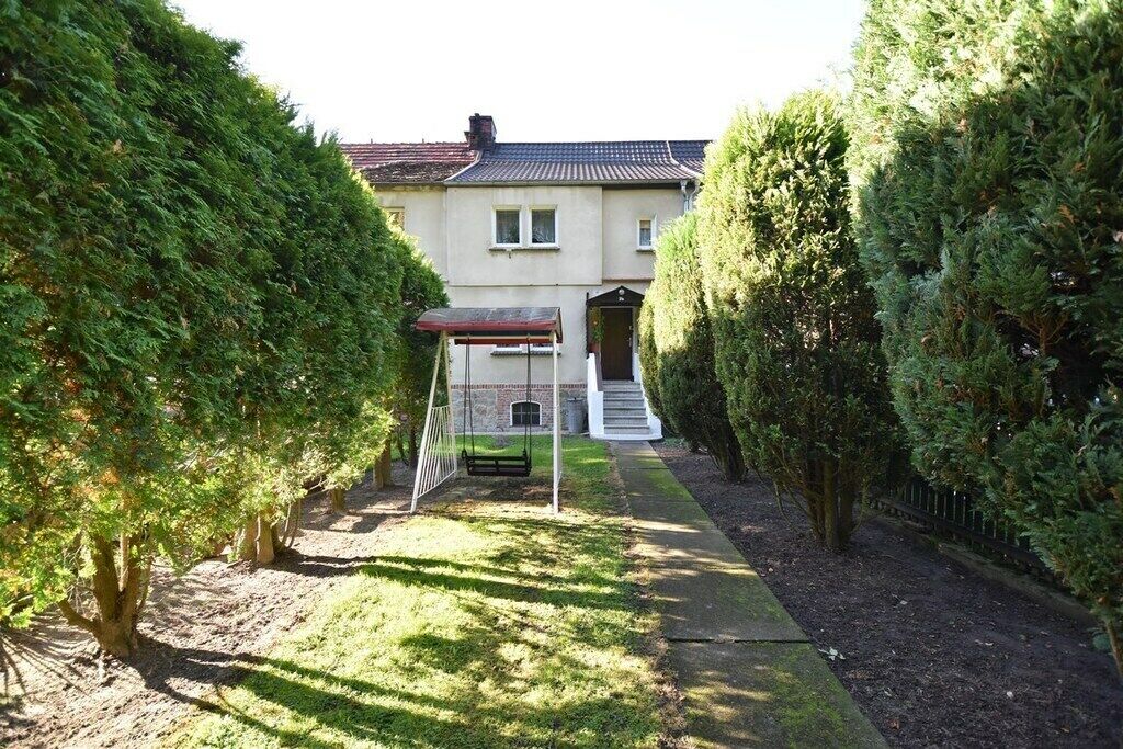jabłka, gruszki czy orzechy. Teren przed domem ogrodzony siatką. W
